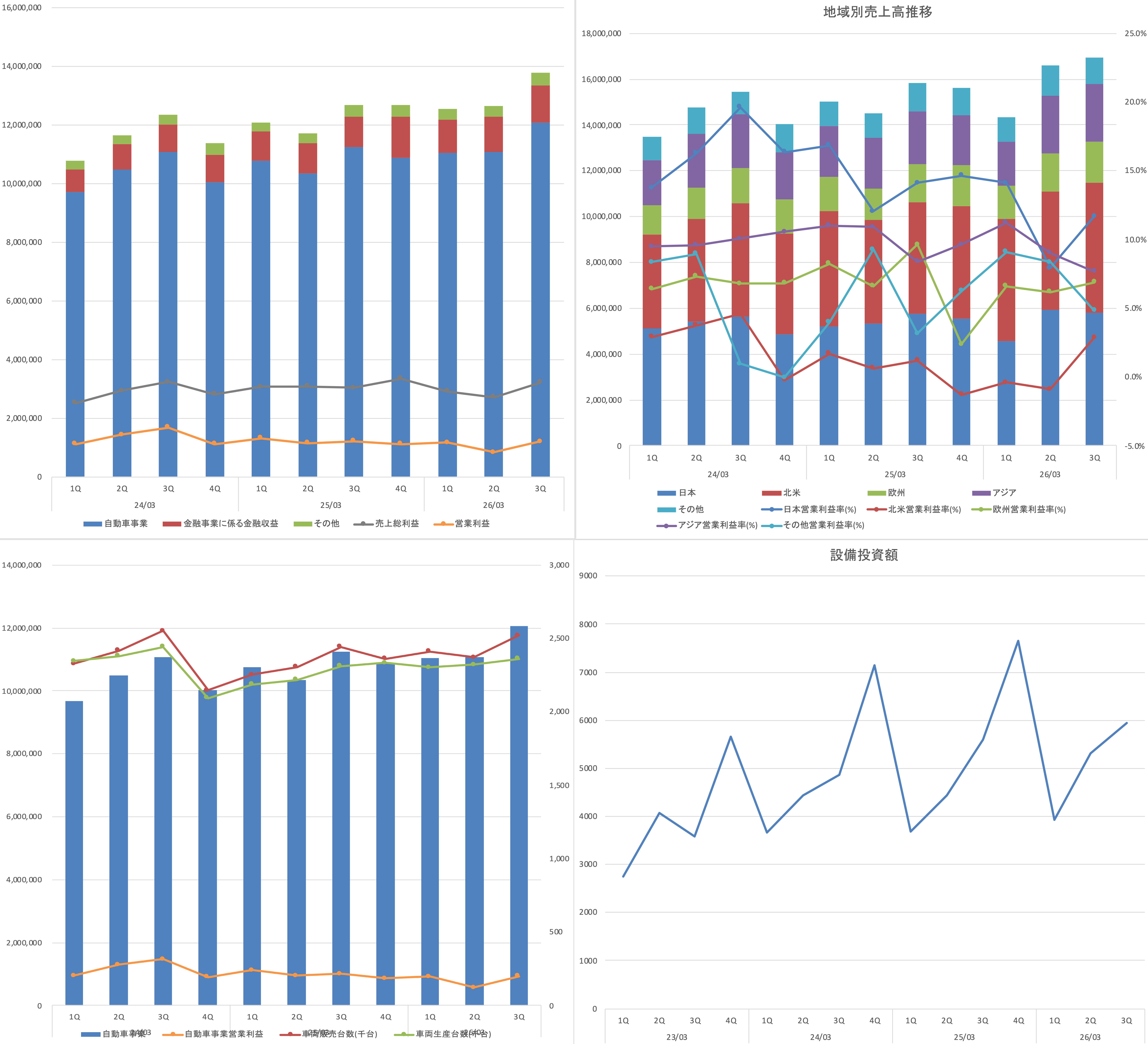 自動車事業ではセダン、SUV、トラック等の多種多様な車両をハイブリッド車(HEV)や電気自動車(BEV)などのマルチパスウェイ戦略に基づいて展開している。収益の柱は車両および補給部品の販売である。 現在の収益構造の特徴はレクサスやSUVといった採算性の高い車種の販売比率を維持・向上させることで、資材高や仕入先への労務費支援といったコスト増分を吸収している点にある。また、利益貢献度の高いHEVで着実に稼ぎつつ、その利益をBEVや次世代動力源の先行投資に充てる構造となっている。販売台数の伸びだけでなく、一台あたりの収益性を左右する車種構成の管理がこの事業の重要な指標である。