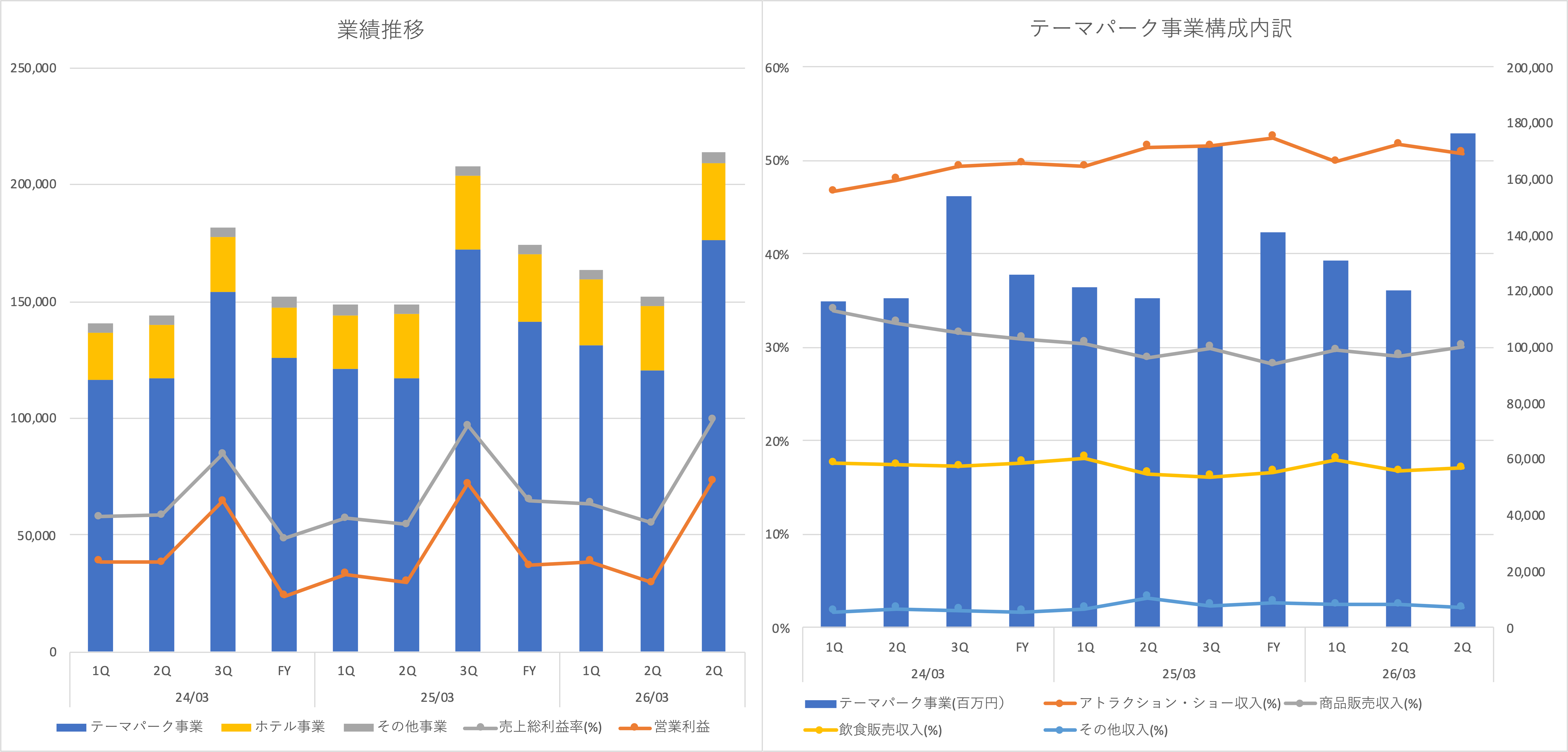 増収要因: 2026年3月期は2024年6月にディスニー・シー開園以来初めて追加されたテーマポートであるファンタジースプリングスが通期稼働したため、テーマパークおよびホテル事業の両面で大幅な増収を達成している。新エリアや新ホテルの開業は業績に大きな影響を与える。