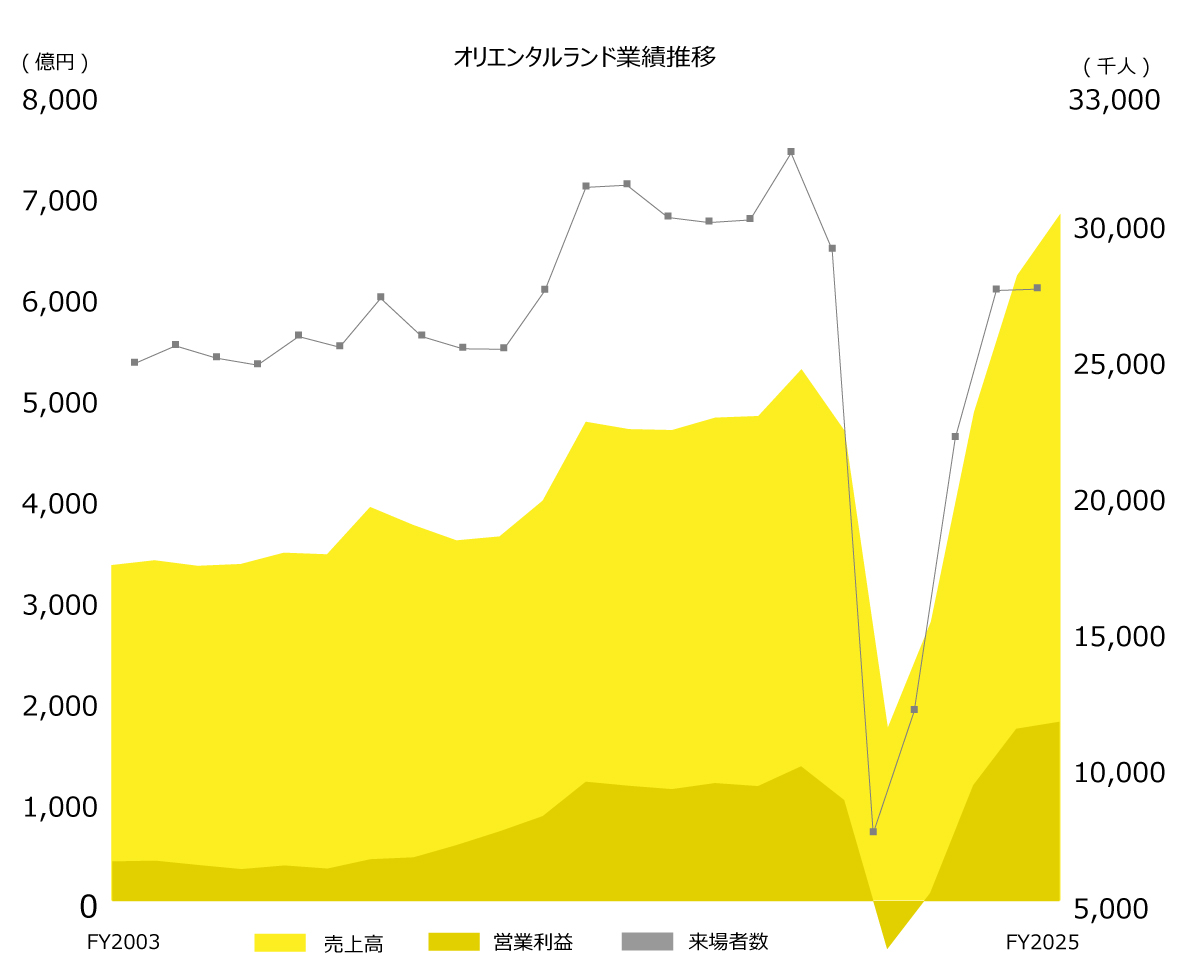 テーマパーク事業では東京ディズニーランドおよび東京ディズニーシーを運営しており、入園料・商品販売・飲食販売を収益の柱とする。現在の最重要KPIであるゲスト1人当たり売上高を牽引しているのが有料の優先搭乗サービスディズニー・プレミアアクセス(DPA)である。ディズニー・プレミアアクセスとは パーク入園後に公式アプリを通じて特定のアトラクションやパレード、ショーの体験時間を指定して購入できる有料予約サービスである。このDPAは単なる利便性向上にとどまらず、来場者数を過度に増やさずともアトラクション・ショー収入を最大化させる収益モデルの核となっており、変動価格制によるチケット単価の調整と合わせて混雑緩和による満足度向上と高単価化を両立させている点が現在の同社における運営方針を象徴している。来場者数がコロナ禍前の過去最高水準まで戻りきっていない背景には戦略的判断と外部環境の変化という2つの側面がある。同社は量より質への転換を重視し、入園者数をあえて抑制することで混雑を緩和し、ゲストの体験価値を高める方針を継続している。また、記録的な夏の猛暑による屋外活動の回避や週末の雨天といった避けることのできない自然環境の影響も入園者数の伸びを抑える要因となっている。しかし、こうした意図的な抑制や外部要因下にあってももゲスト1人当たり売上高は最高を更新し続けており、適切な入園者数管理のもとで高い収益を上げる構造が定着している。